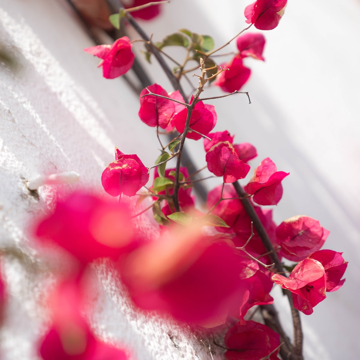 I took this photo in Sintra, walking along the coast. The flowers were growing on a vine that climbed up the white plaster wall of a staircase. I tilted the horizon to point the vines straight up through the frame and play with the long shadows they cast against the plaster.