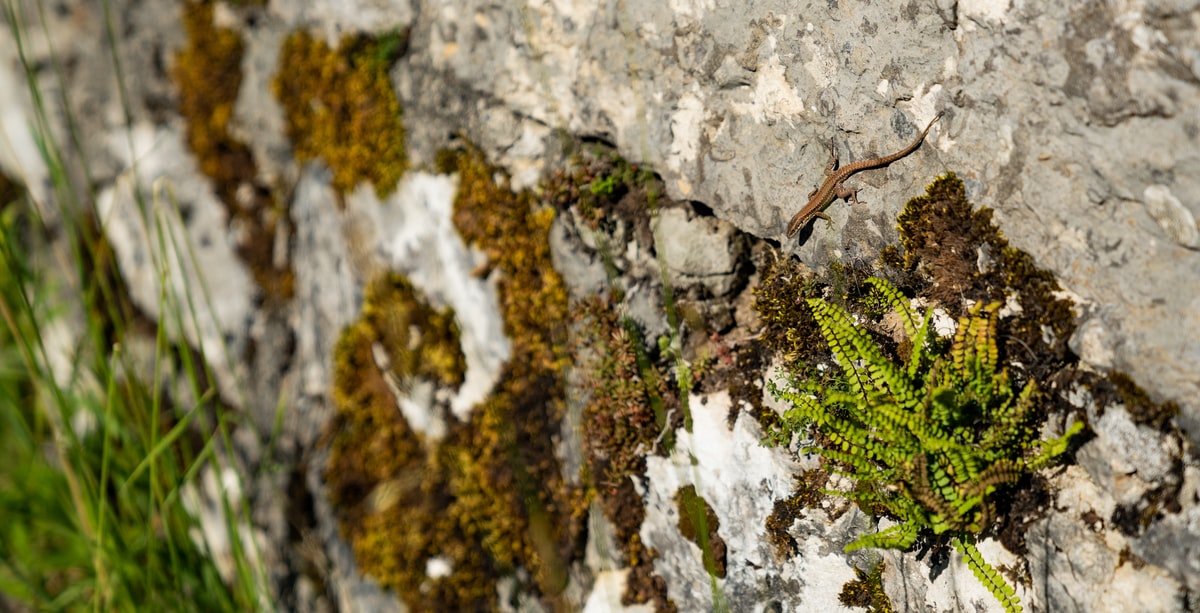 A lizard clings to the stone walls lining the Klötzli vineyard in Ligerz, Switzerland
